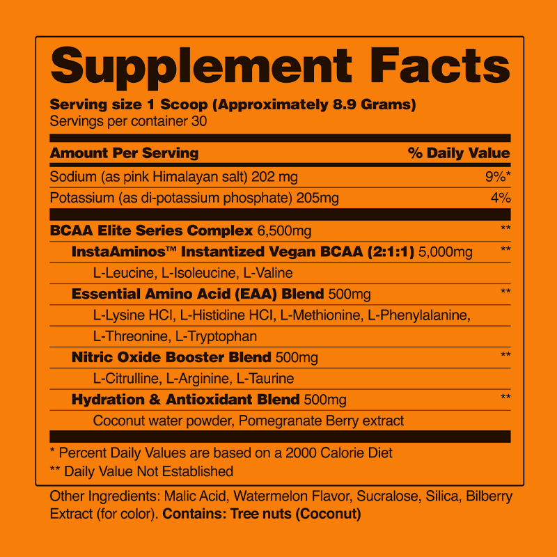 উপাদান: সোডিয়াম, পটাসিয়াম, BCAA এলিট সিরিজ কমপ্লেক্স, তাৎক্ষণিক ভেগান BCAA, প্রয়োজনীয় অ্যামিনো অ্যাসিড মিশ্রণ, নাইট্রিক অক্সাইড বুস্টার মিশ্রণ, হাইড্রেশন ও অ্যান্টিঅক্সিডেন্ট মিশ্রণ