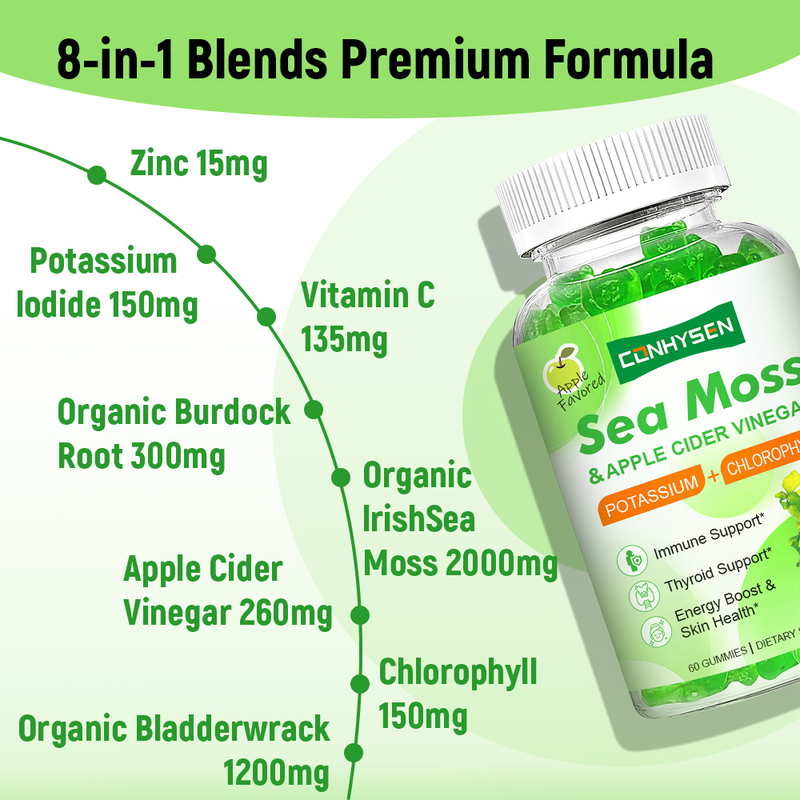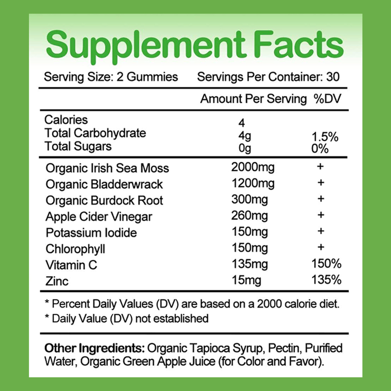 জৈবিক আইরিশ সি মস, ভিটামিন সি, জিংক, জৈবিক ব্লেডারওয়ার্ক, জৈবিক বারডোক রুট, আপেল সিডার ভিনেগার, পটাসিয়াম আইওডাইড, ক্লোরোফিল