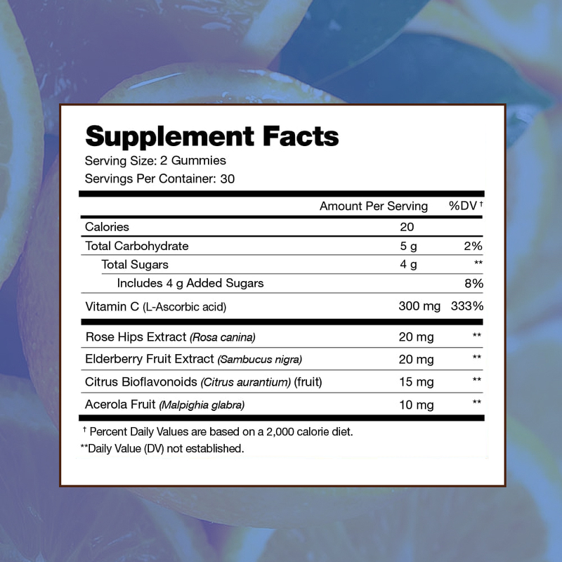 ভিটামিন সি, রোজ হিপস এক্সট্রাক্ট, এल्डरবেরি ফলের নির্যাস, সাইট্রাস বায়োফ্লাভোনয়েডস, অ্যাসারোলা ফল