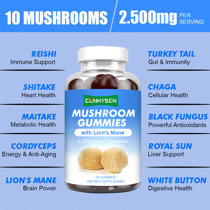 মাশরুম গামি সরবরাহকারী কাস্টম 10-ইন -1 ফর্মুলা সমর্থন হার্ট স্বাস্থ্য