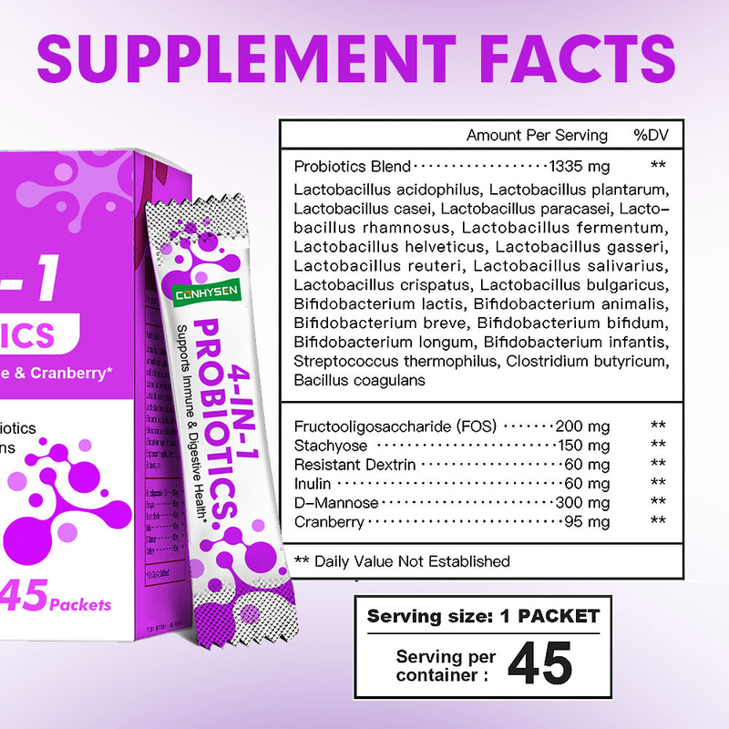 প্রোবিওটিক্স মিশ্রণ, FOS, স্টাচিয়োজ, প্রতিরোধী ডেক্সট্রিন, ইনুলিন, ডি-ম্যানোজ, ক্র্যানবেরি
