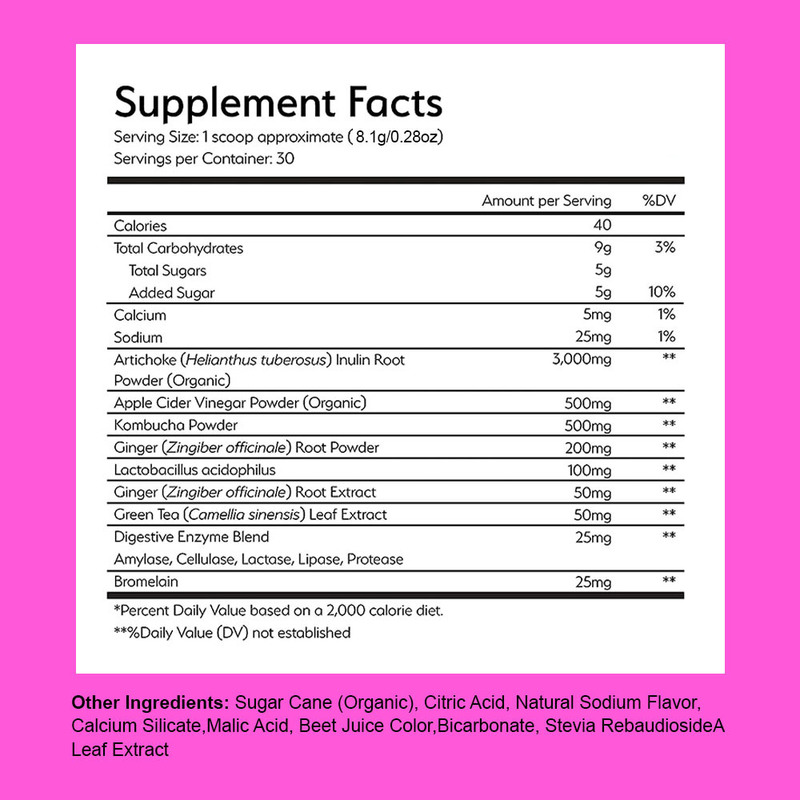 Calcium, Sodium, Artichoke Inulin Root Powder, Apple Cider Vinegar Powder, Kombucha Powder, Ginger Root Powder, Lactobacillus acidophilus, Green Tea Leaf Extract, Digestive Enzyme Blend, Bromelain